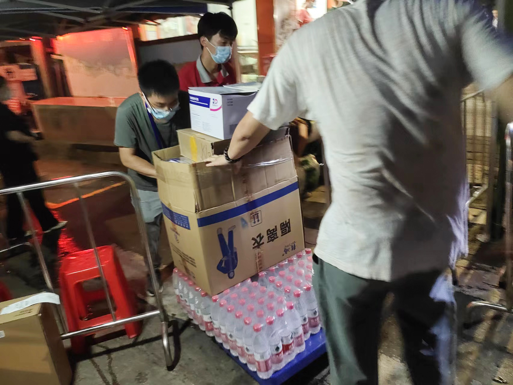 志愿者們肩扛手抬,搬運礦泉水、防護用具等生活用品,保障現(xiàn)場工作人員的物資充足。
