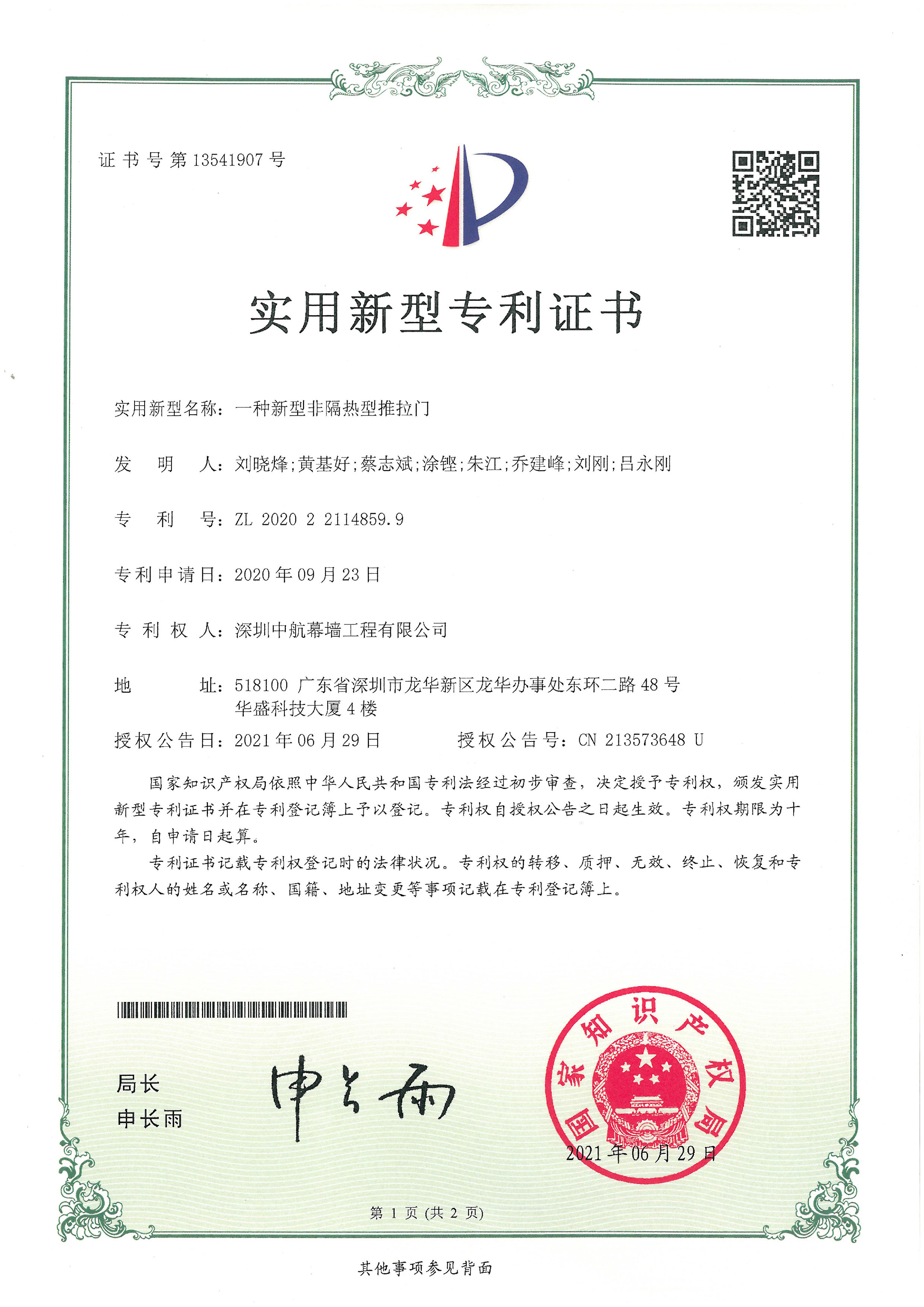 熱烈祝賀深圳中航幕墻工程有限公司的發(fā)明“一種新型非隔熱型推拉門”于近日獲得國(guó)家發(fā)明專利證書(shū)。本次專利證書(shū)申請(qǐng)項(xiàng)目由我公司自主研發(fā),于2020年9月23日提交“一種新型非隔熱型推拉門”(專利號(hào):ZL.2020 2 2114859.9)。經(jīng)中華人民共和國(guó)國(guó)家知識(shí)產(chǎn)權(quán)局層層審評(píng),于2021年6月29日獲得正式授權(quán)并下發(fā)國(guó)家發(fā)明證書(shū)。授權(quán)公告號(hào):CN213573648U,證書(shū)號(hào)第13541907號(hào)。