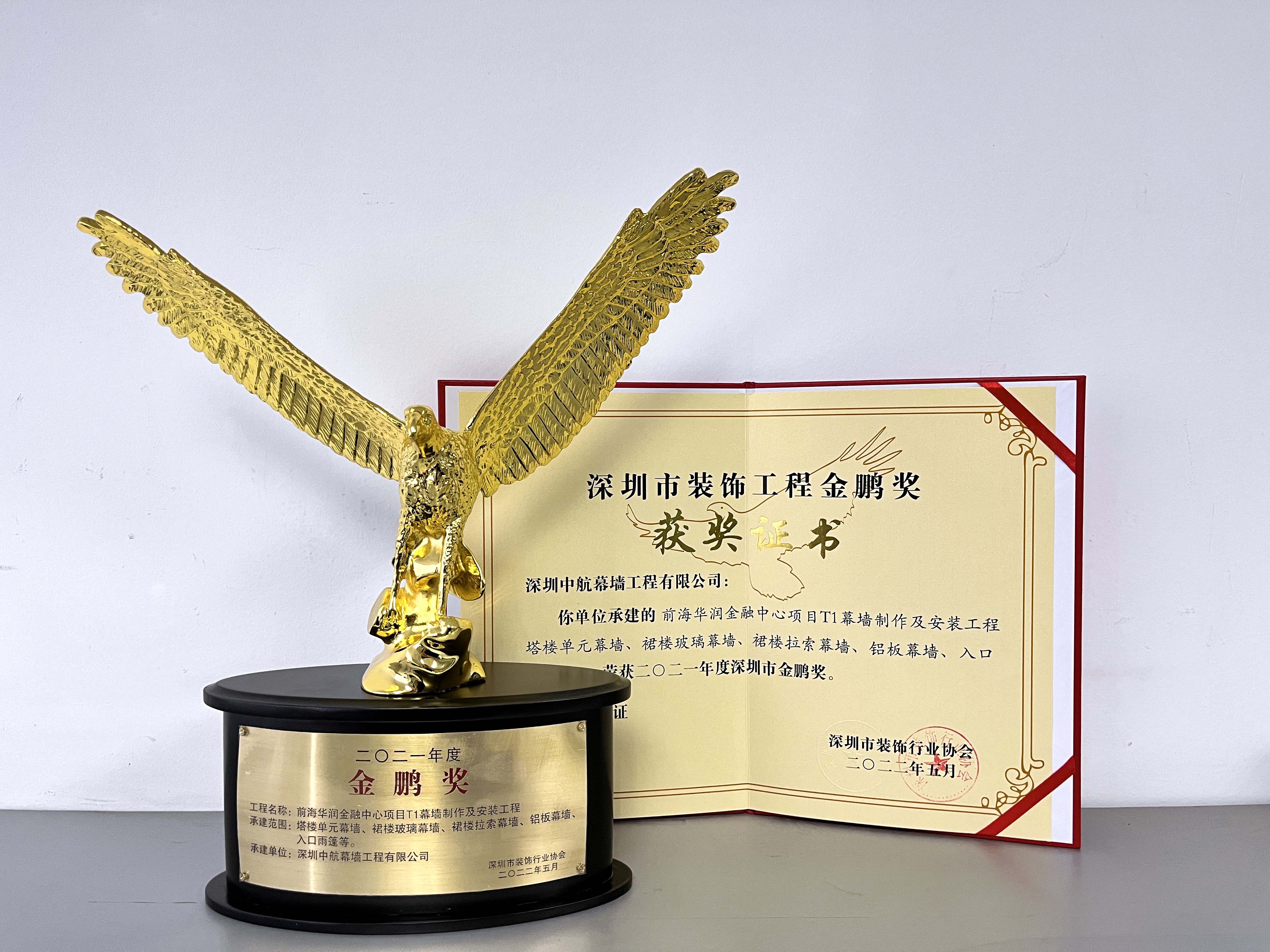 近日,由深圳裝飾行業(yè)協(xié)會(huì)開展的2021年度深圳市裝飾工程“金鵬獎(jiǎng)”評(píng)選結(jié)果揭曉,深圳中航幕墻工程有限公司承建的前海華潤(rùn)金融中心T1項(xiàng)目幕墻制作及安裝工程榮獲“深圳市裝飾工程金鵬獎(jiǎng)”。